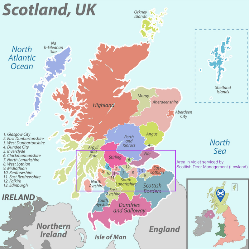 Highland areas are generally well covered by Deer Management Groups (DMGs). We provide cover for landowners in the areas indicated on the map on the right and can serve DMGs in other parts of Scotland.